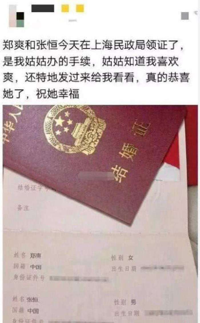 12月9日,网上有爆料称郑爽与张恒在上海领证了,并且晒出了结婚证,爆料的网友还称是自己的姑姑为两人办理的结婚手续。这个消息被爆出来,立马引发了不少关注,毕竟郑爽的感情生活一直很精彩,现在她和张恒要修成正果,不少网友都送上了自己的祝福,祝福郑爽终于找到了值得依靠的人。