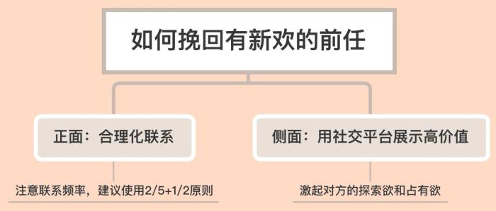 但是,如果是题主这种有新欢的情况下,最佳挽回时期就会往后延长1-2个月,即最佳复合时间为分手后的2-3个月。时间过短,新欢的新鲜感会阻挠你重新进入他的生活;时间太长,对方已经和新欢培养出了新的感情,这个时候你再想去挽回,就会遇到重重现实因素的阻力(比如对方父母反对、你自己内心关于道德感的挣扎等等)。