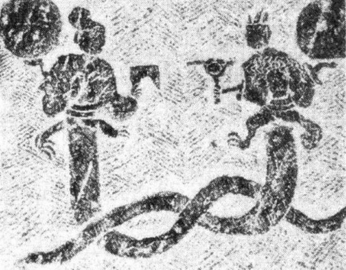 在河南出土的一块石头上,刻有一幅伏羲女娲图。这幅图的前面刻有两朵烟,象征着夫妻的结合。在汉朝的墓石上,伏羲和女娲的画像做了交尾状,上面把伏羲画成了鱼鳞身躯,女娲则是蛇形身躯,以此,暗示蛇神和女神的意思。