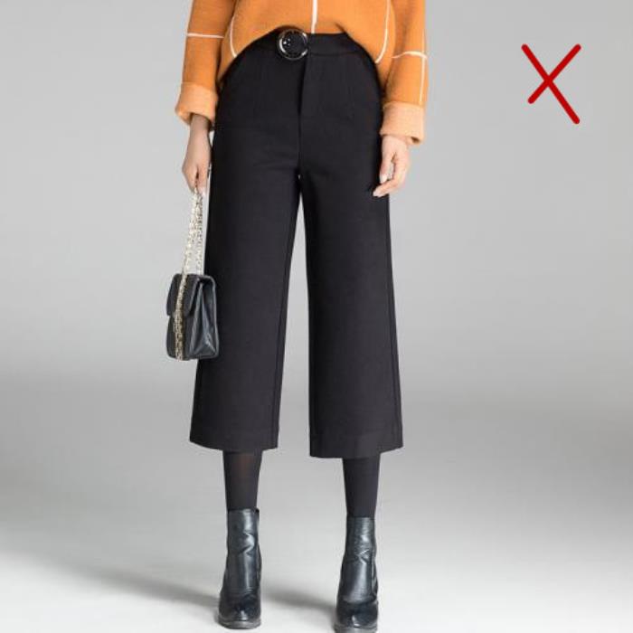 七分长度的裤子,看得人尴尬症都出来了。半长不短的长度,再加上宽宽的裤腿,露出纤细的小腿,这种半吊子穿法可不是一个会穿女人的首选。