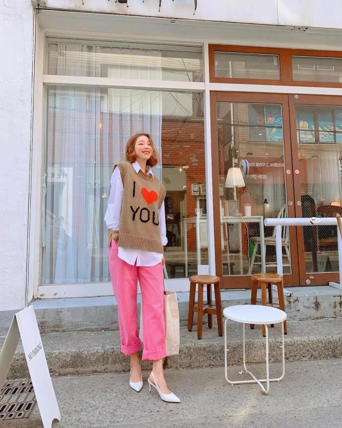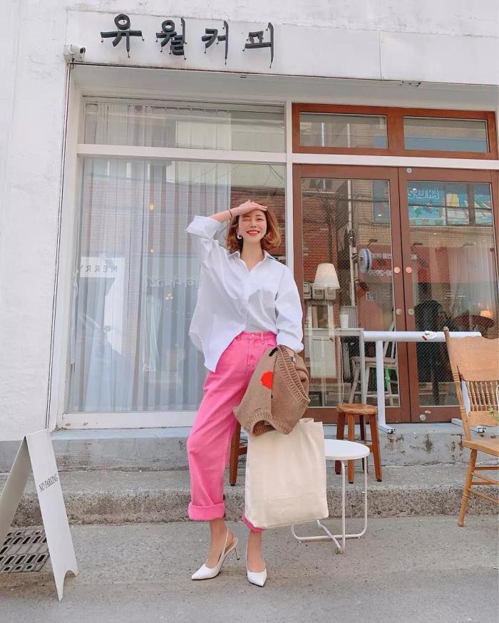 白衬衫搭配粉红直筒裤,九分穿衣法运用得刚刚好,很有春天的味道。休闲的白衬衫是属于春天的,随便穿就是风景。