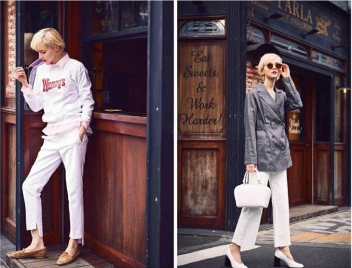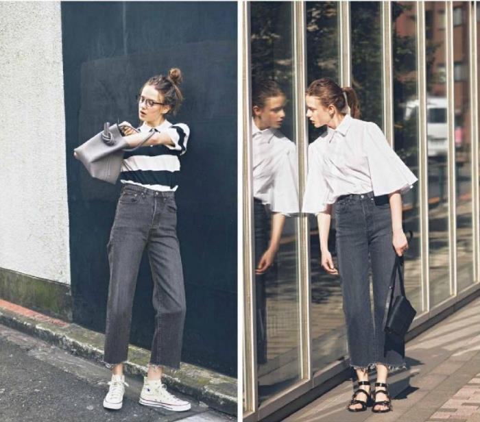 牛仔裤依然是主流,但是它结合了其它元素之后变得又经典又时髦。如果是长裤,你可以用挽裤脚的穿法让它变成九分裤,露出脚踝,穿出时髦。