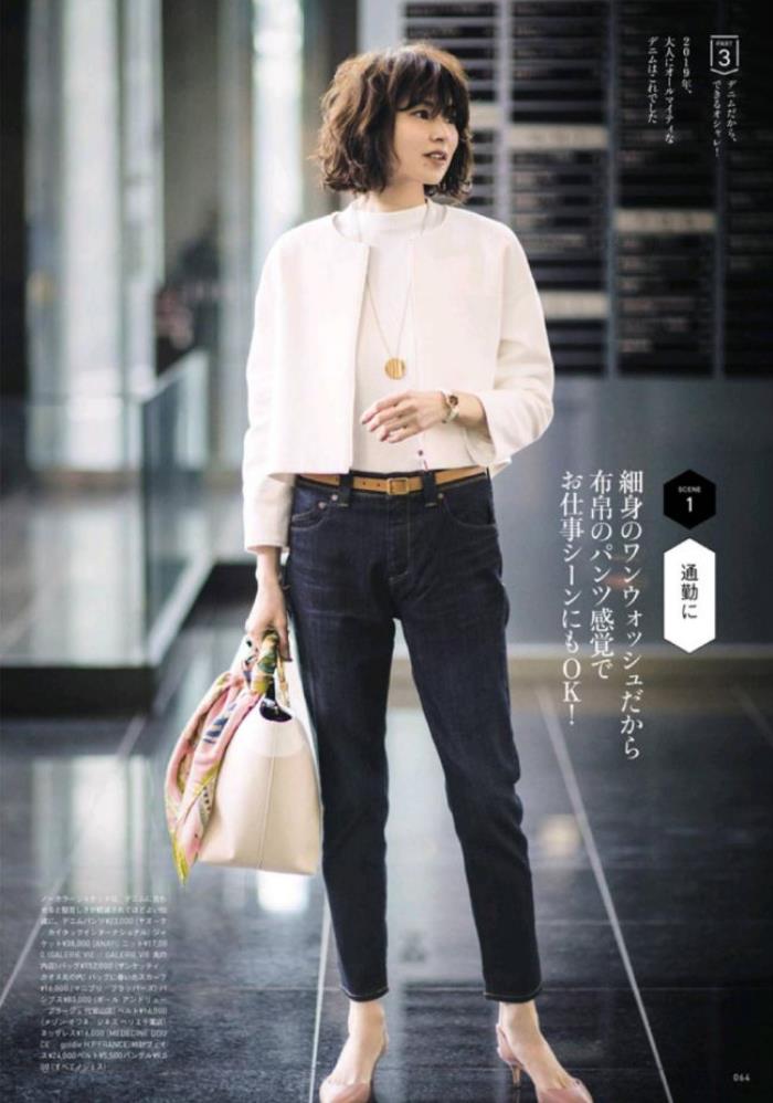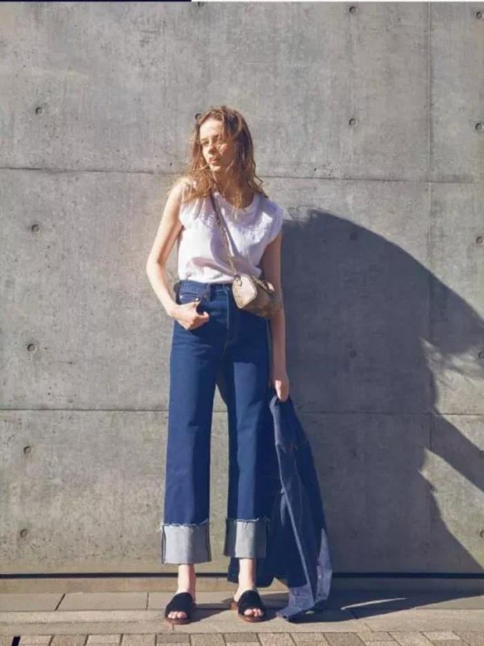 通勤款的九分牛仔裤特别好穿,牛仔裤的穿着精髓还是要挽裤脚最好看。露出纤细的脚踝、达到显瘦的目的。
