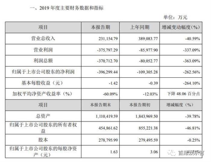 2019年,华谊兄弟巨亏39.6亿元,同比减少262.32%;实现营收21.86亿元,同比减少43.81%。