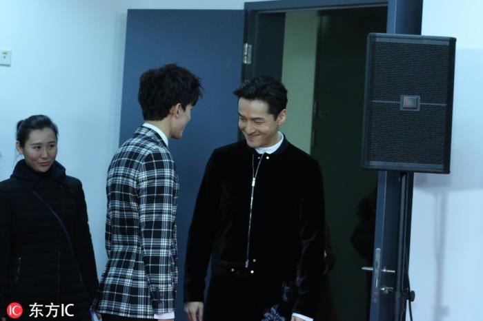 胡歌与吴磊在后台遇到,“梅长苏”与“小飞流”这对“主仆”相遇,两人都十分激动。(图片署名: 东方IC)