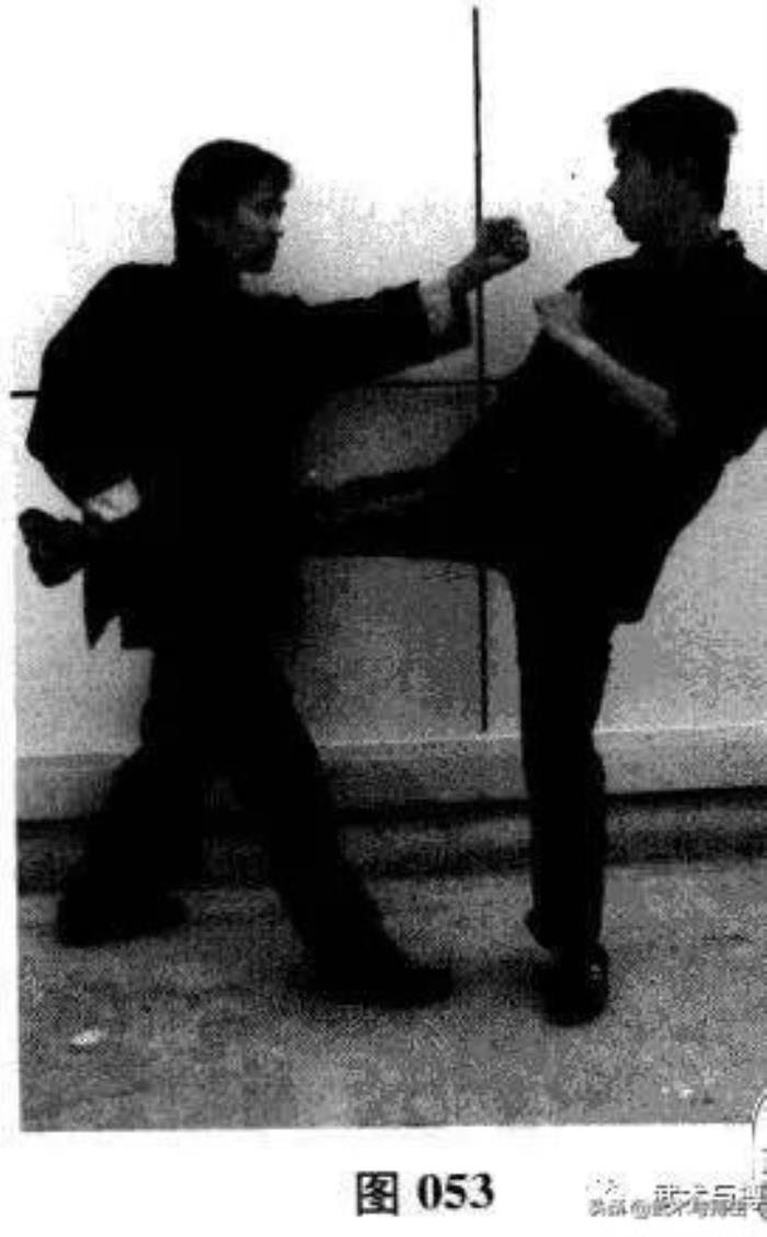 耕手时常和日字冲拳配合使用.称为耕手冲拳;多用于消解中路攻击的腿法和拳法。耕手冲拳是一种防守反击性的手法。在街头打斗中用之最广,多用于反击敌方攻来的正蹬腿(图053)