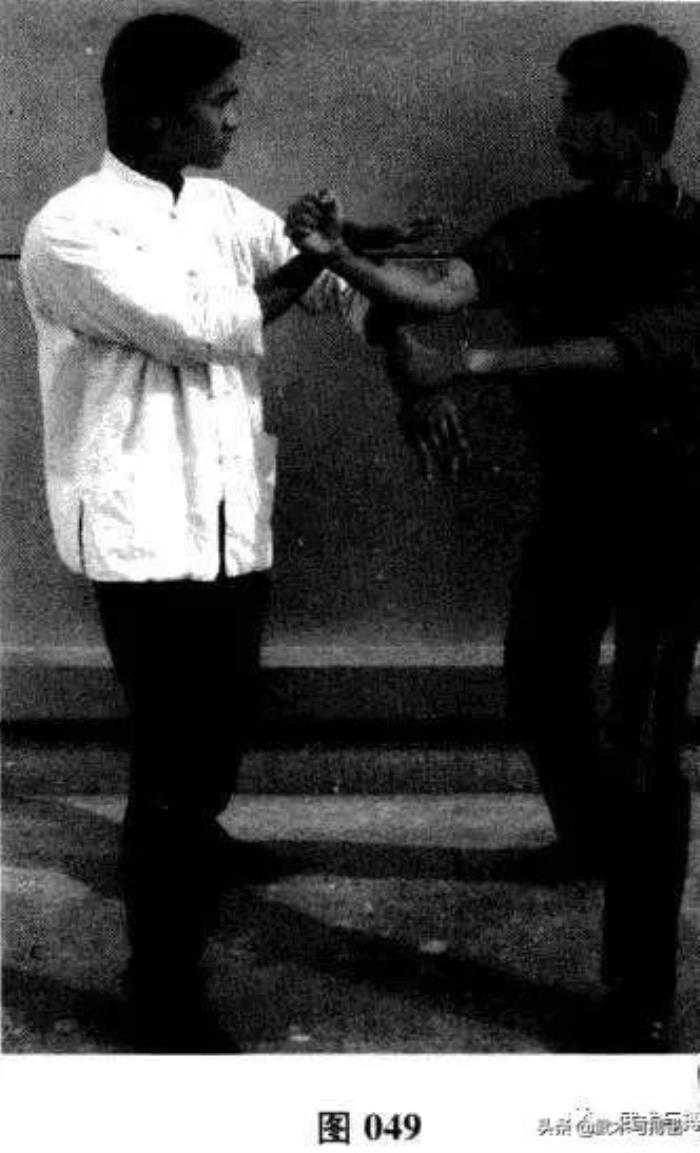 捆手多与口字冲拳结合起来使用,又称捆手冲拳(图049).捆手练得好,可凭借瞬间捆拉之力,令对手突然失重,前冲数步甚至失重摔倒。