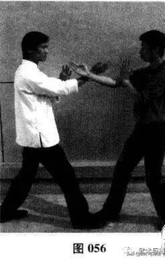 咏春拳历来有“讲手”的礼仪,讲手指的是同门之间或者和别派高手之间切磋武术。比武切磋开始之初,双方对峙时.咏春门人往往使用问手的起式(图056),既表示以武会友,点到为止;又可以将平时通过藕手训练获得的灵敏肌肤感应力.通过问手发挥出来,随时变招,或直冲对方重心,以攻制攻,或牵引对方来力,后发制人。