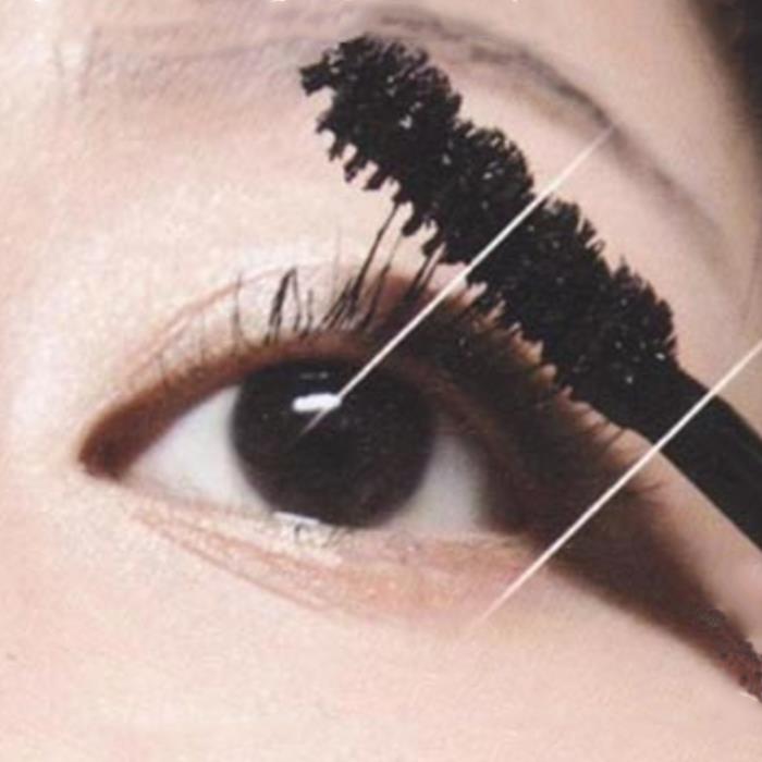 将睫毛分成三等分,在画线的区域内刷睫毛膏。睫毛刷要保持水平,从睫毛根部开始以“Z”的形状运动。刷的次数最多不能超过8次,不然容易粘成一团。
