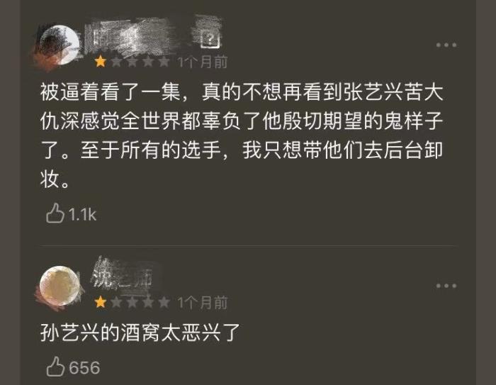 而《青春有你》综艺节目也没好到哪里,最有意思的是很多一星评论真的很无厘头,“张艺兴的酒窝恶心”、“张艺兴表情苦大仇深”等等,虽然是一个综艺节目,虽然100名训练生才是主角,但莫名其妙的,网友对张艺兴的个人好恶,也已经影响到了整个节目。