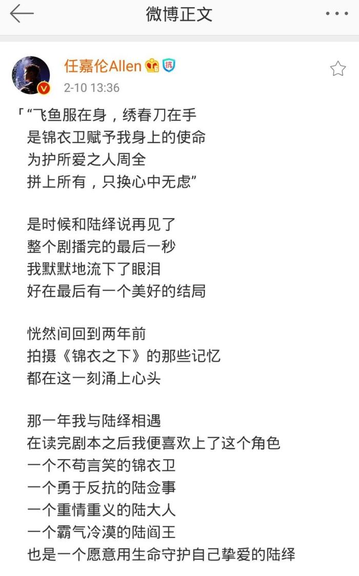 《锦衣之下》大结局了,多少不舍和遗憾,任嘉伦更是发长文感慨不舍之情,真是太有心了。#锦衣之下#