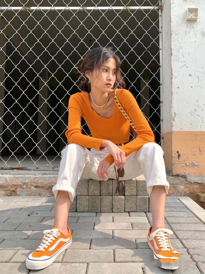 0橙色上衣配白色九分裤,这样的搭配更加清爽甜美,白色系自带干净优雅的气息,配橙色上衣有一种甜美的感觉。尤其是这种九分裤的设计,不会出现压个子的可能,视觉上更加显高。配同色系的鞋子,整体风格更加协调。