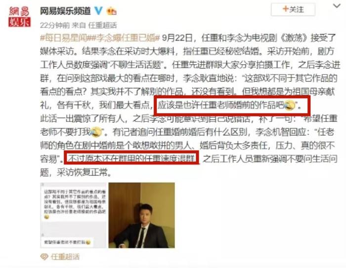 9月22日,由任重李念主演的电视剧《激荡》正式开播。开播前作为主演的李念和任重接受了媒体的采访,可是没想到采访中却发生了不太愉快的事情。