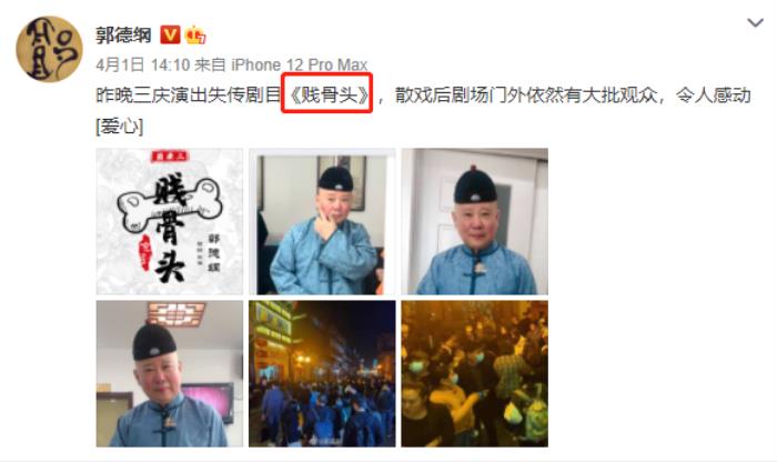 而就在4月1日,郭德纲发了一条自己在三庆园演出失传剧目《贱骨头》的微博,不知道是不是在暗讽侯耀华和何云伟二人。