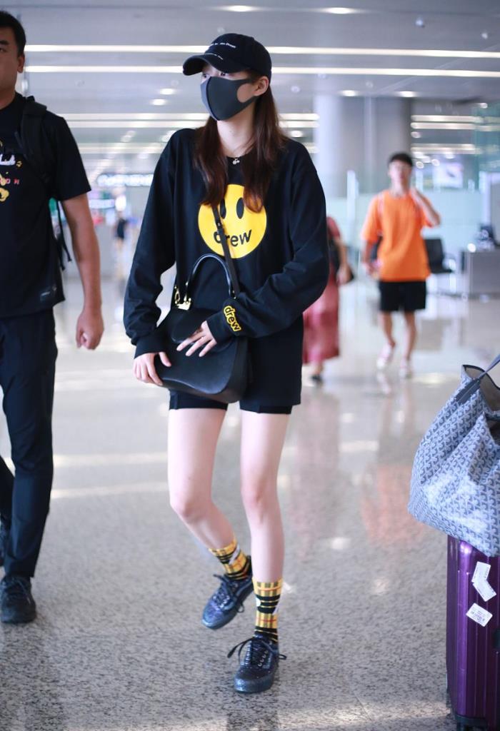 像简单的T恤、卫衣短裤等,既可以穿出时尚星范,同时又看起来年轻活波,相比装成熟的西装要好的多。黑色卫衣配黑色健美裤玩,大长腿衬得修长笔直,T恤上的笑脸表情包,可爱心情佳。