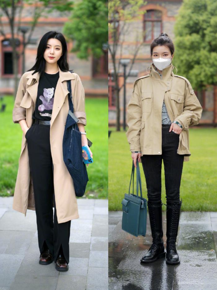 早春的话,可以选择一件风衣,小个子选择臀上长度更显高,宽松的风衣和修身的裤子,既能遮住上身的肉肉,还能勾勒出纤细的双腿,简直是梨型身材姑娘的福音。