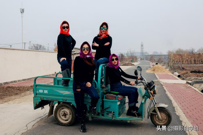 (1)道具,和此次摄影主题相关。黑衣服的一组照片,主要体现摩登乡村风,上面有一张图中的三轮车,和这个主题就很相关。