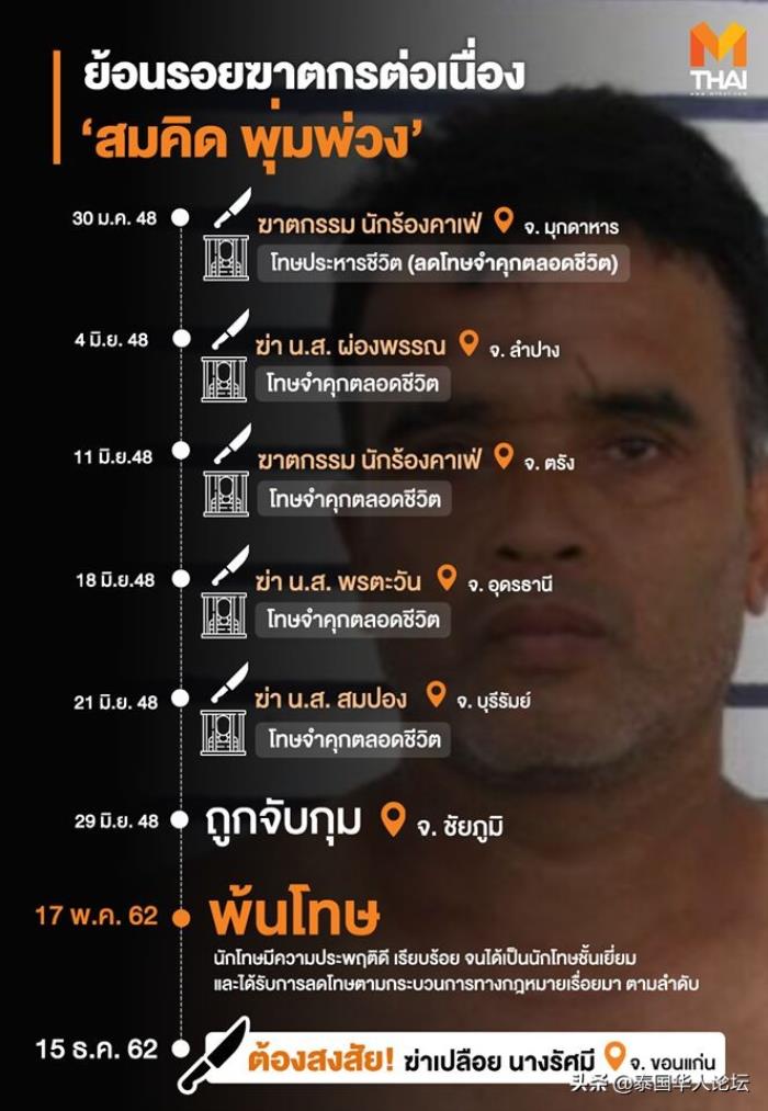 据多家泰媒报道,颂吉绰号泰国“开膛手杰克”,有连环杀人案底。早在2005年1-6月期间,颂奇就先后杀害5名女子(1月份杀1人,6月份连续杀4人),受害人分别2名泰国咖啡馆驻唱女歌手及3名泰国女按摩师,5名死者均死在酒店,连续犯案后颂吉被警方逮捕,并于2005年6月26日被判入狱,坐牢14年之久,2019年5月17日出狱。但出狱后的他死性不改,6个月之后于12月15日再度犯案以往日作案的同种手法杀害51岁的保洁员拉萨米。据了解,当晚死者拉萨米被发现时,其遗体被被子包裹、下半身赤裸、颈部被缠胶带、脚裸被人用充电线捆绑住,死相较惨。