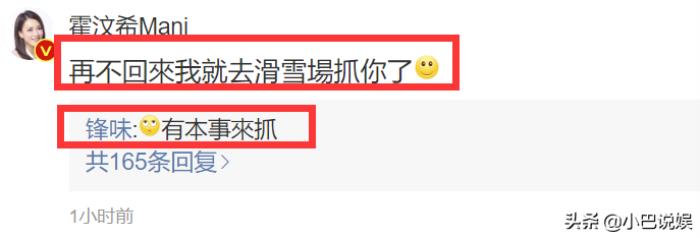 对此谢霆锋也调侃对方过来啊,这互动让人看着就很有画面感,试想霍汶希要是穿上滑雪服颤颤悠悠地去抓一个滑雪老手,想想都觉得可笑,当然也有网友觉得霍汶希太可怜了,滑雪场上的谢霆锋跟个兔子一样,谁能抓得住呢?尤其霍汶希后面也回复到,对方滑那么快,自己怎么能抓到呢?
