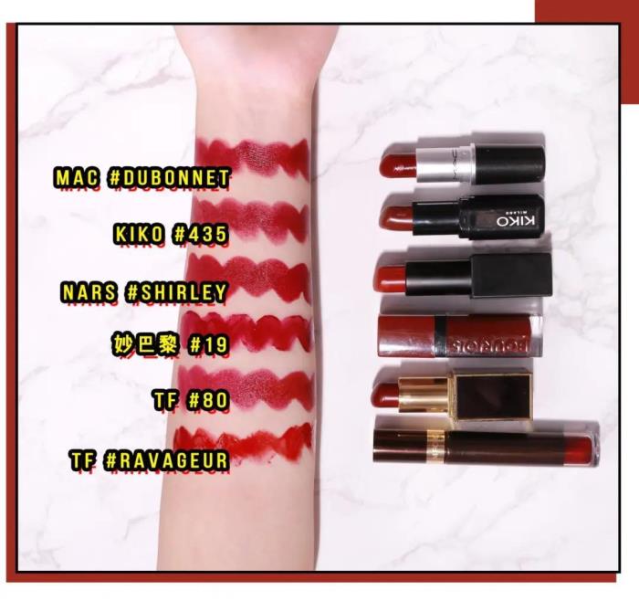 妙巴黎#19妙就妙在它跟刚才几支都不一样!不偏紫不偏棕,管你黄白黑皮涂了它当场肤色提亮一个度(但是质地不好难涂匀szd)TF#80虽然很美但不建议盲撸,它覆盖力比较弱,所以受自身唇色影响会很大。