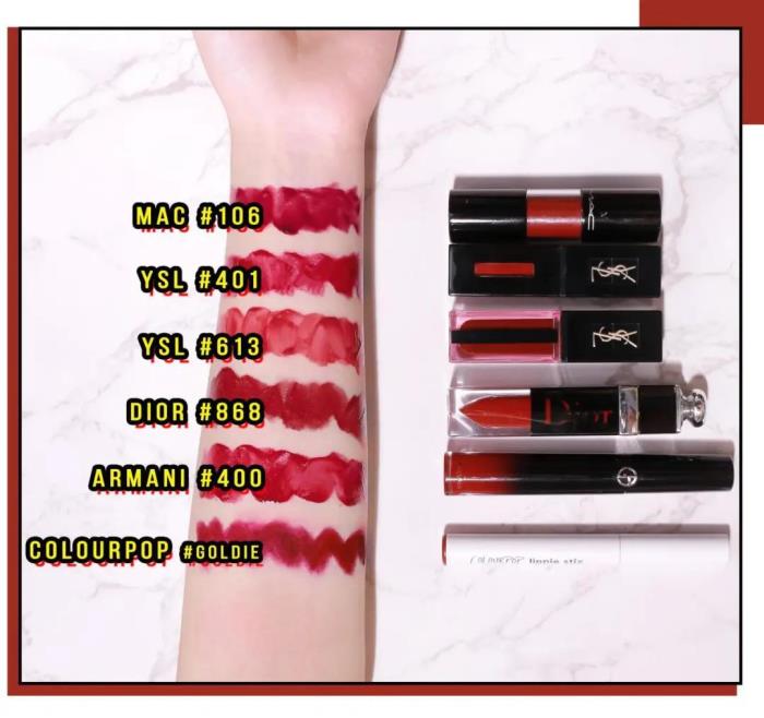 古早网红车厘子MAC棒棒糖#106和YSL黑管#401都属于偏紫的车厘子,厚涂时#106的饱和度更高一些,也更浓郁。colourpop唇笔#goldie就恰恰相反,它在薄涂的时候紫调非常明显,但涂得很厚的时候反而偏红。