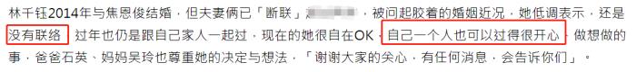 事实上,焦恩俊和林千钰已经断联了3年之久,两人究竟是为了什么事情而互不理睬,夫妻俩始终不肯透露,但从林千钰的多次采访中,听得出来她对焦恩俊还有留恋。