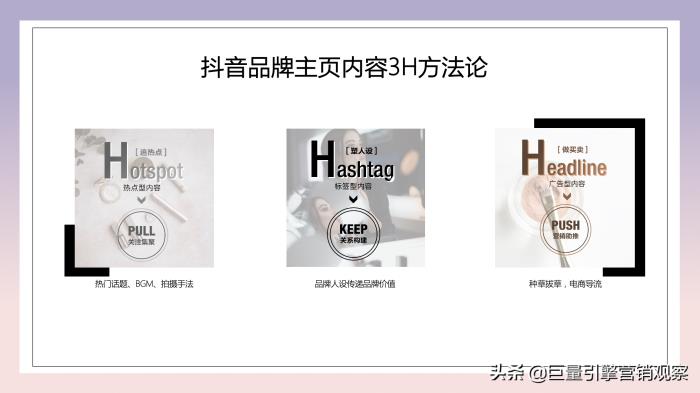 首先是在品牌曝光层面,通过建立品牌阵地实现短期内大范围曝光。比如建立品牌号,沉浸展示品牌权益;运用3H方法论——hotspot(追热点)、hashtag(塑人设)、headline(做买卖),经营品牌主页内容,协助品牌号内容充分曝光。