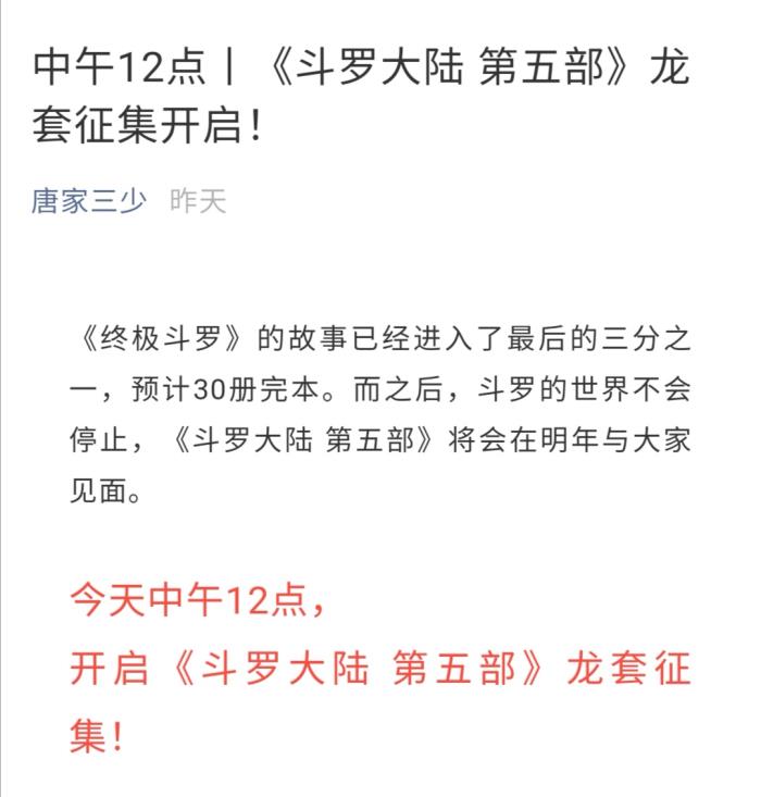 据唐家三少所言,《终极斗罗》的故事已经进入了最后的三分之一,预计30册完本。而之后,斗罗的世界不会停止,《斗罗大陆 第五部》将会在明年与大家见面。现在也在公众号上开启了《斗罗大陆 第五部》的龙套征集。