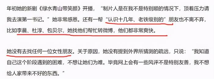 马苏遇到圈内排挤的时候,所有的女性朋友都离自己而去,只剩下男性朋友了,比如李晨、杜淳、包贝尔会公开帮她发声。