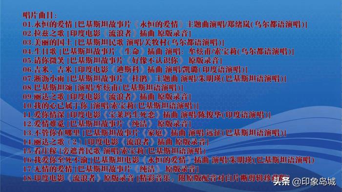 曾几何时,印度、巴基斯坦的电影在中国穿来荡去,游弋大众心间,而这些电影里的歌曲更是让人荡气回肠。这张专辑收录了巴基斯坦电影《永恒的爱情》主题曲、印度电影《流浪者》插曲及原版录音、巴基斯坦故事片《生命》插曲、印度电影《迪斯科舞星》插曲等依旧为众人回味的曲目。