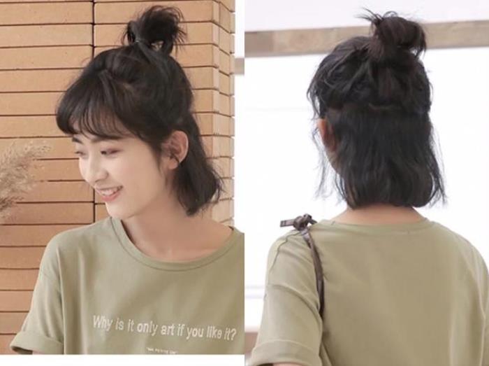有很多女生对短发的喜爱度更高,除了更加清爽舒适外,也有可能是身材比较矮小,短发可以减小发型在造型中的占比,进而更显高,这是发型搭配的小心机。半丸子头扎发需要的头发并不多,仅仅需要一小撮头发就可以扎起来了,当然了,长发姑娘也可以这么扎。