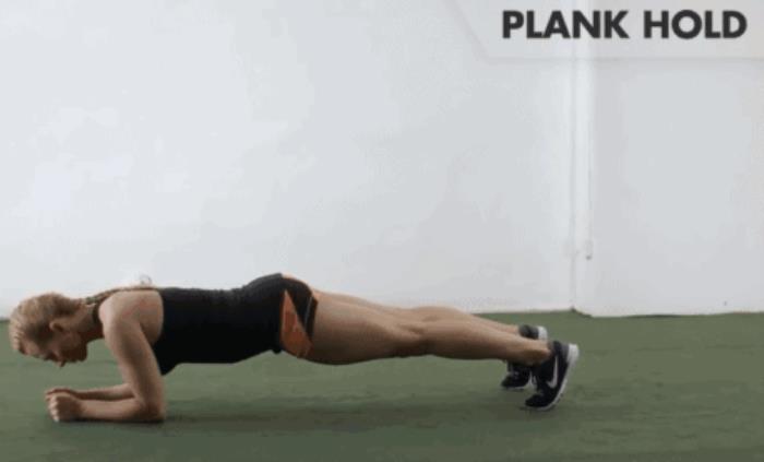 这个动作可以锻炼背部、臀部、腹部的肌肉群。双肘与地面垂直,双腿夹紧,脚部并拢,脚尖撑地,眼睛看向地面。头部、臀部、脚部呈一条直线。最好坚持1分钟。