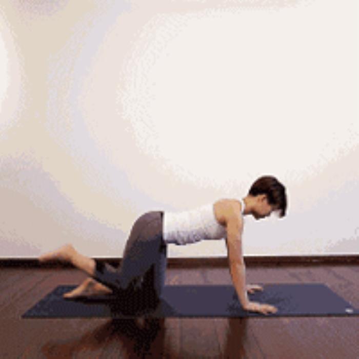 双手撑地,以一只膝盖为支撑点,另一只腿平直快速太高,再慢慢落下,左右腿交叉练习,一次10下,做三组。