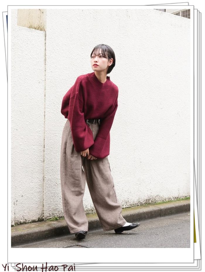 酒红色针织上衣,时尚的灯笼袖和高领。轻松的轮廓充满潮流时尚感。搭配米色阔腿裤,整体上营造出宽松的轮廓,显得时尚摩登。