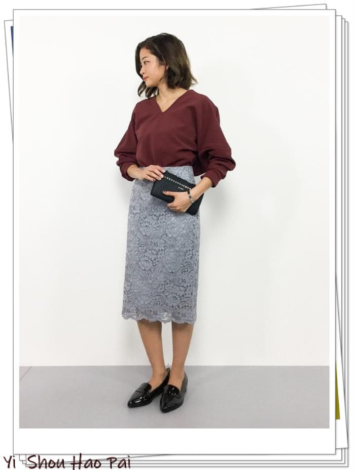 优雅的蕾丝紧身半身裙是一款出色的产品,适度的灰色。酒红色套头衫在蕾丝半身裙上方,带来清新外观。V领显得精致。在你的脚上穿一双尖头的乐福鞋,以增添些许男性气息。