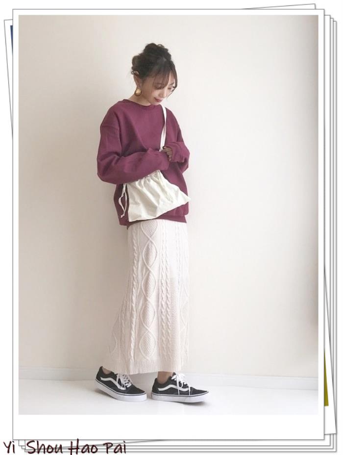 针织长裙的柔软优雅外观。酒红色和白色搭配得很好,可以增强秋冬季节的气氛。酒红色的运动衫很宽松,带来休闲感。