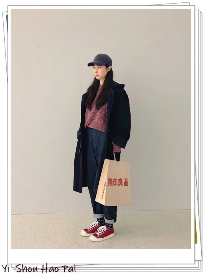 将优衣库的酒红色针织衫和无印良品的基本款大衣和帽子结合在一起。随意卷起牛仔裤露出格子图案袜子也很有效。酒红色的帆布鞋也很不错,与内搭相得益彰。