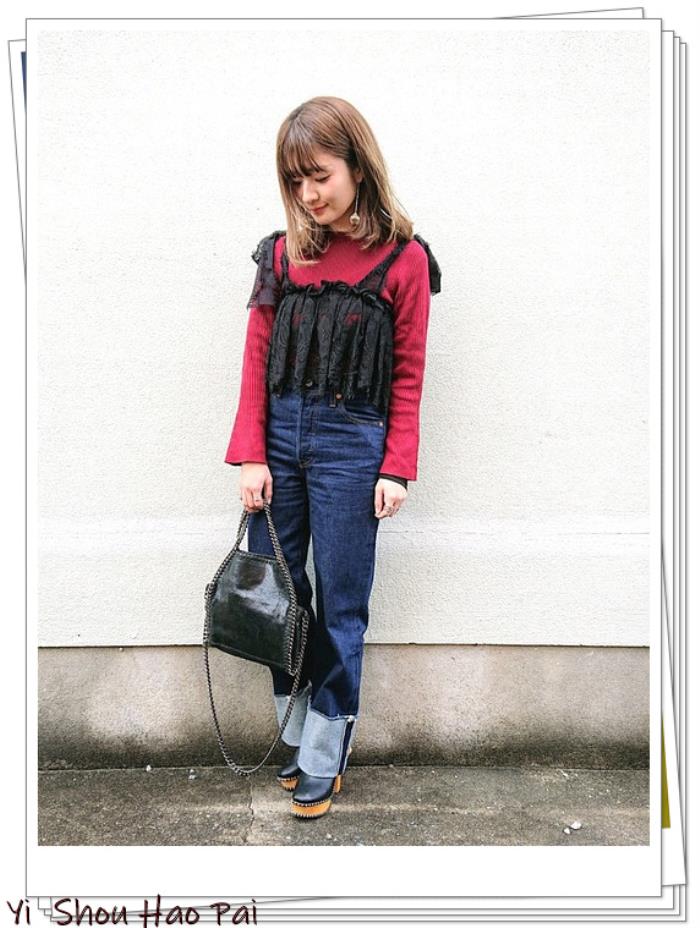 黑色透明蕾丝吊带背心的内搭采用酒红色针织衫,可增强蕾丝花卉图案的魅力。甜美的上半身为牛仔裤造型增添女性气息。木底的靴子会改善腿长效果。