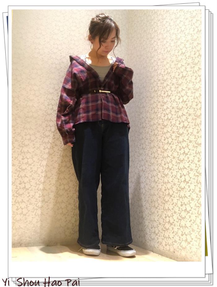 酒红色格子衬衫添加了腰带标记出腰线,水洗牛仔阔腿裤营造出适度的放松感。将衬衫的领口拉开,露出颈部线条,看起来很精致。