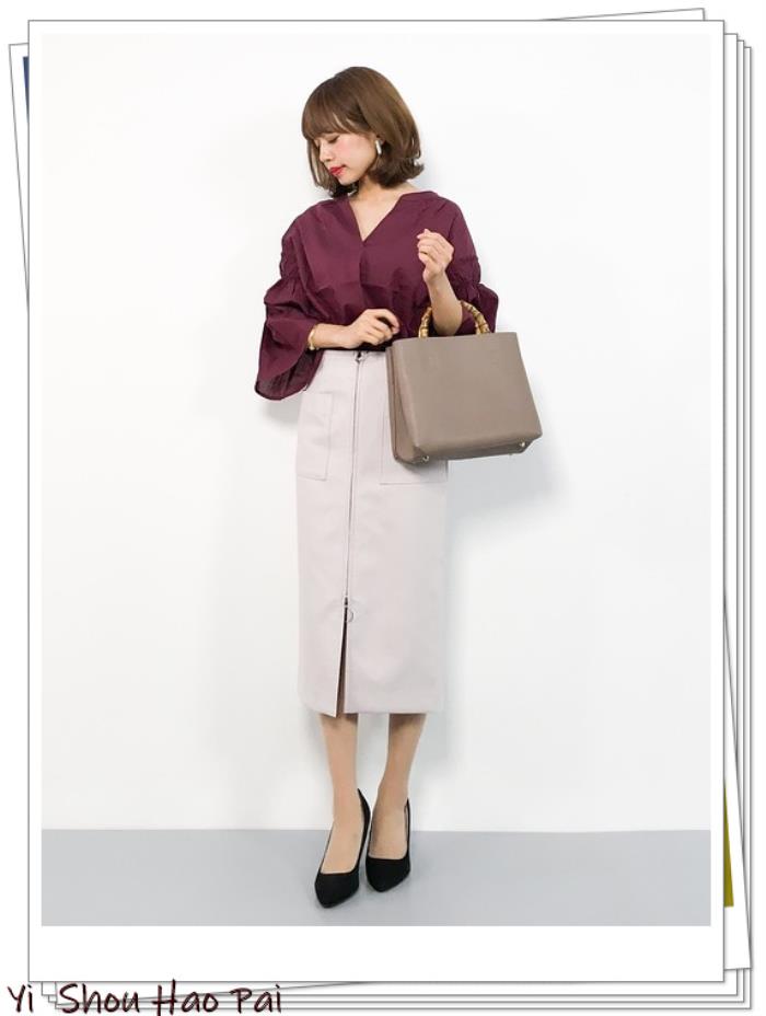 酒红色的上衣配有宽大的袖子和V领,搭配带有口袋的紧身裙,平衡感十足。使腿部线条看起来美丽的长度也适合轻熟女人。如果你用黑色高跟鞋,那么可以完成适用于办公室的优雅穿搭。
