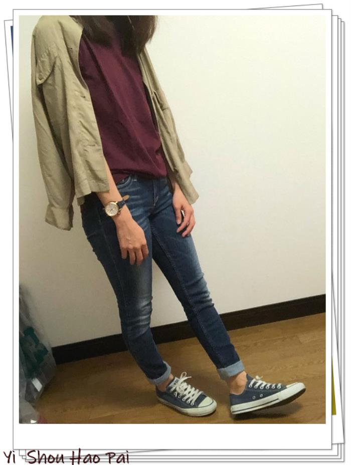 酒红色的优衣库T恤非常适合秋季内搭,它性价比很高,而且容易搭配。如果你是首次尝试酒红色的衣服,可以先试试它。搭配轻薄的衬衫外套,将紧身牛仔裤的裤脚卷起,露出脚踝,搭配帆布鞋,带来轻松活力的休闲感觉。