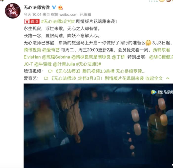 3月3日,《无心法师3》将登陆腾讯,爱奇艺,会员首周更新8集,每周二、三20:00更新2集。