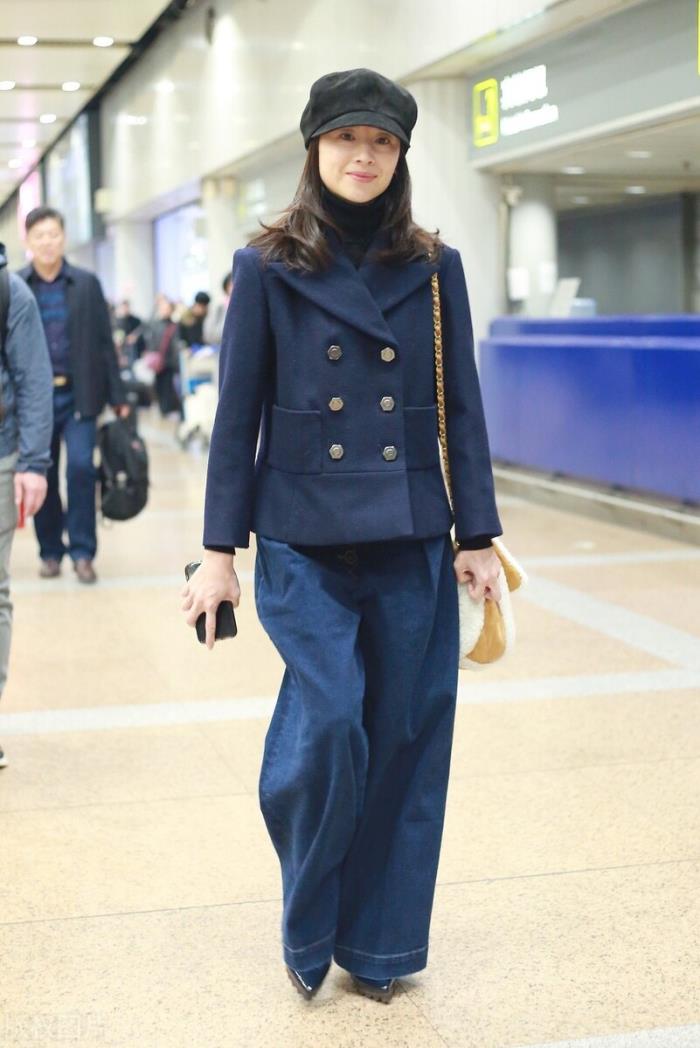 乔欣米色大衣+半高领针织衫牛仔阔腿裤+小白鞋清秀淡雅
