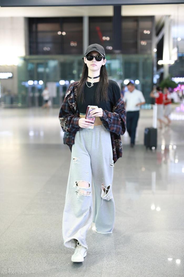 奚梦瑶格纹衬衫+黑色露脐上衣时髦混搭破洞牛仔阔腿裤+小白鞋+黑色棒球帽飒爽有型