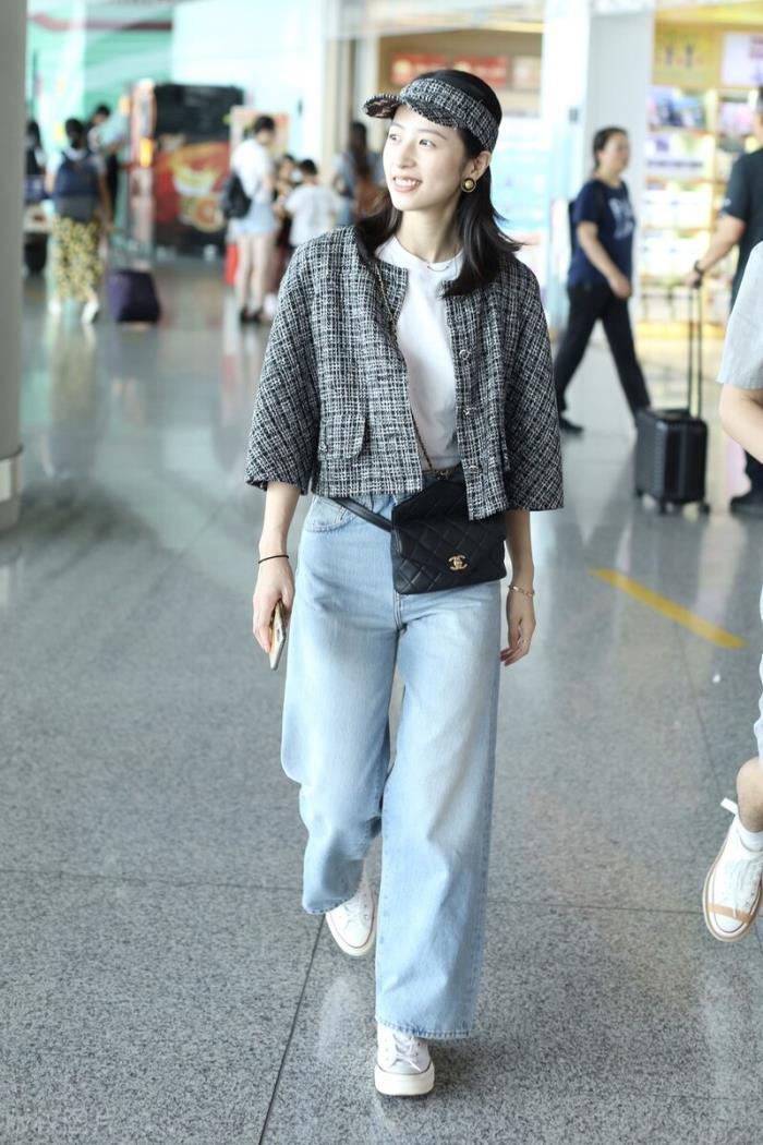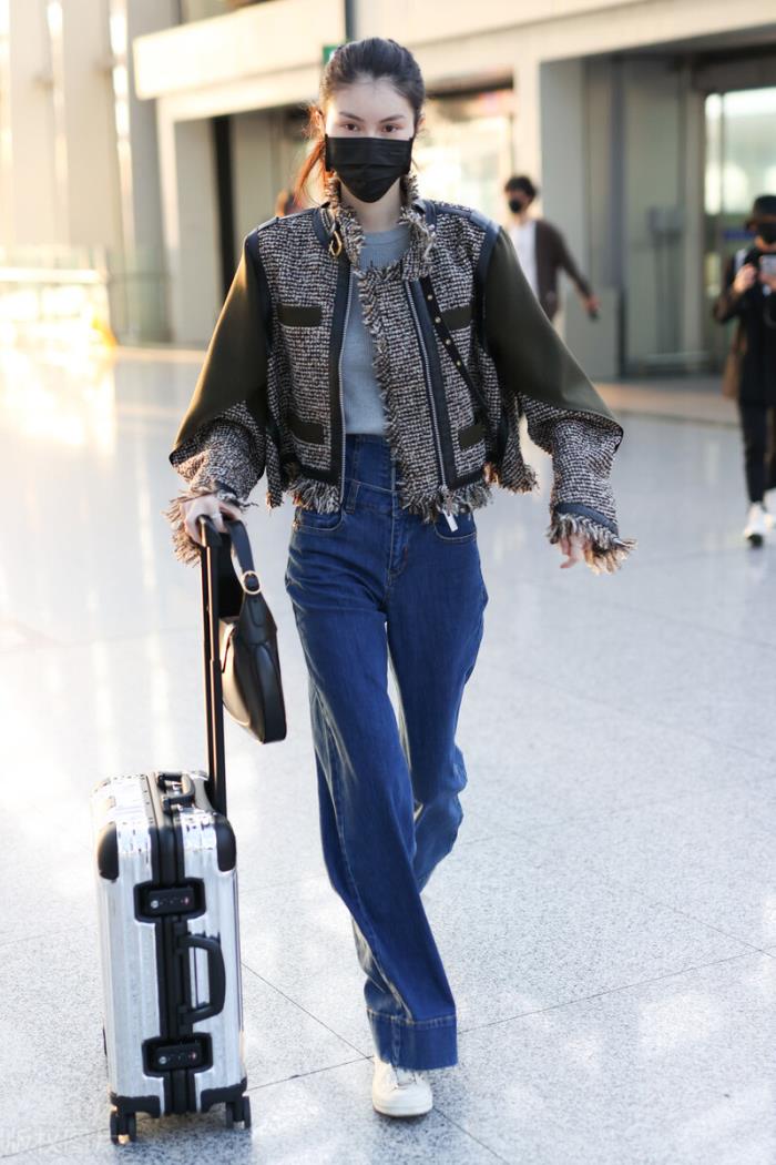 何穗牛仔阔腿裤+粗花呢夹克+Gucci腋下包高挑随性。