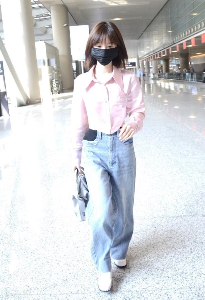 毛晓彤粉色衬衫+牛仔阔腿裤+乐福鞋+灰色手袋时髦Chic。