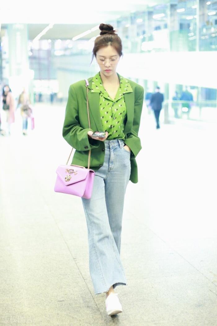 金晨Prada黄色短袖针织衫+牛仔阔腿裤+厚底鞋+白色手袋高挑纤细。