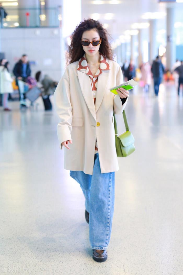 钟楚曦复古羊毛卷+牛仔老爹裤摩登chic。