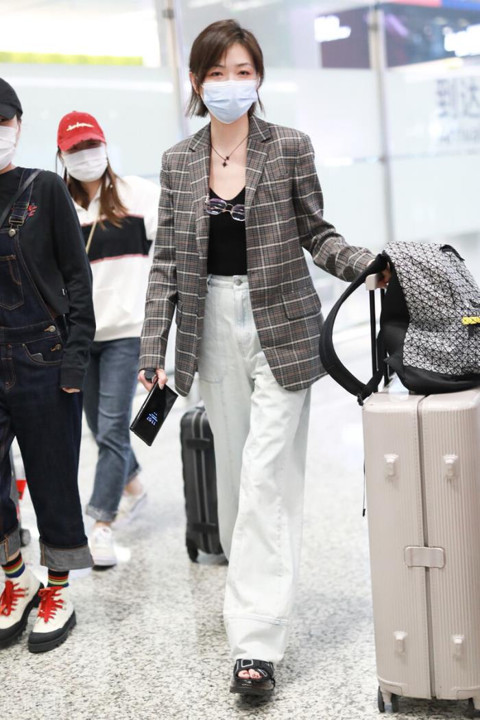 万茜格纹西装+阔腿牛仔裤+凉鞋休闲随意。