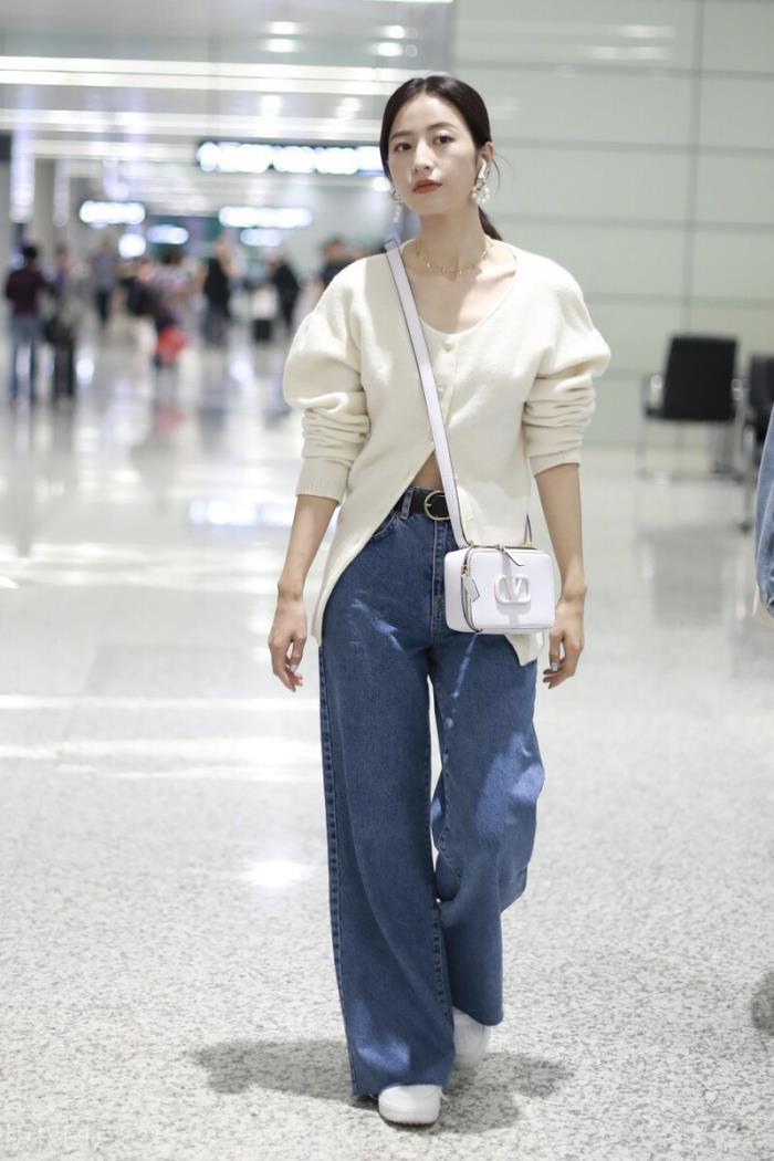 吴谨言白色衬衫+蓝色V领毛衣+牛仔阔腿裤Dior手袋+老爹鞋+渔夫帽清纯可人。